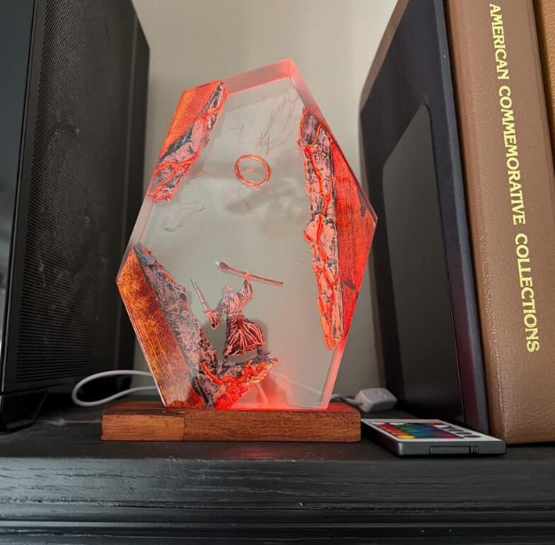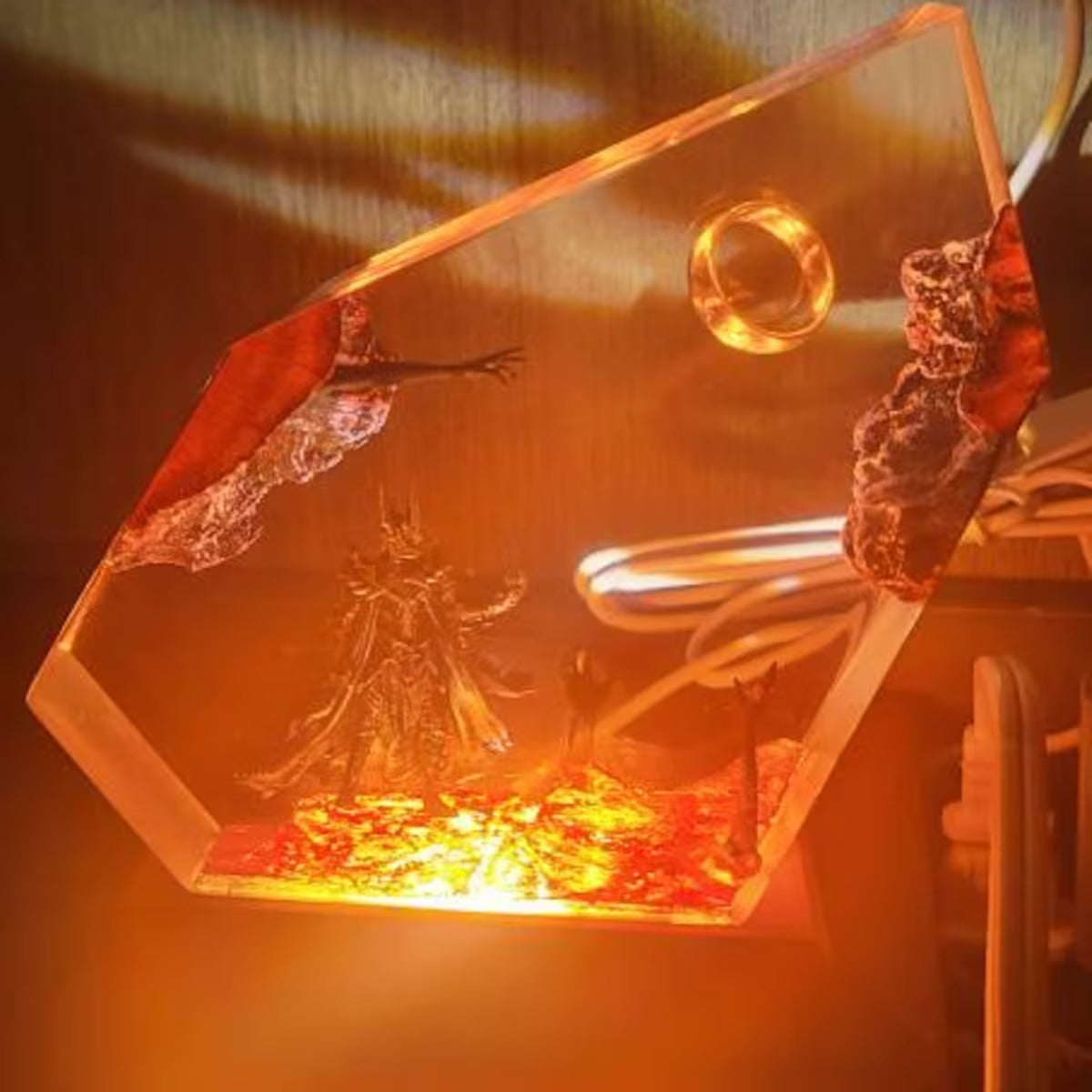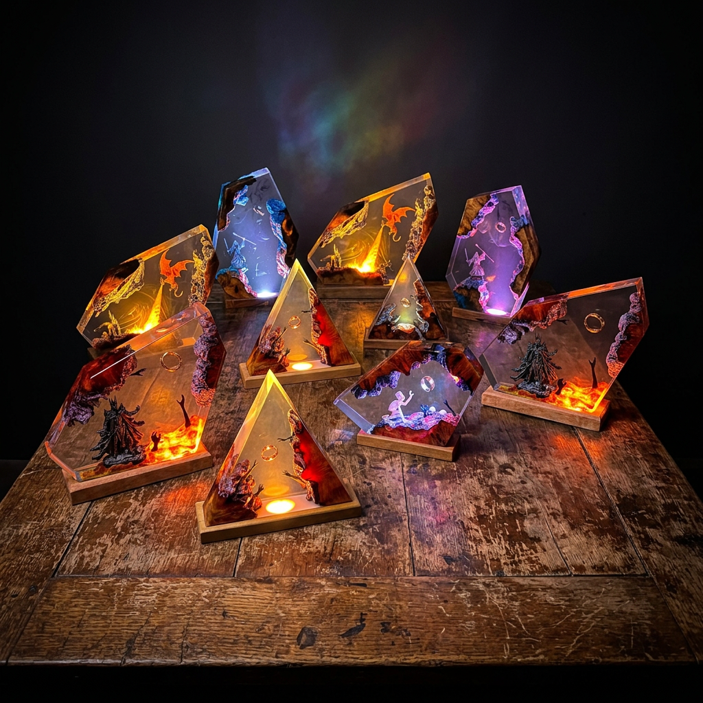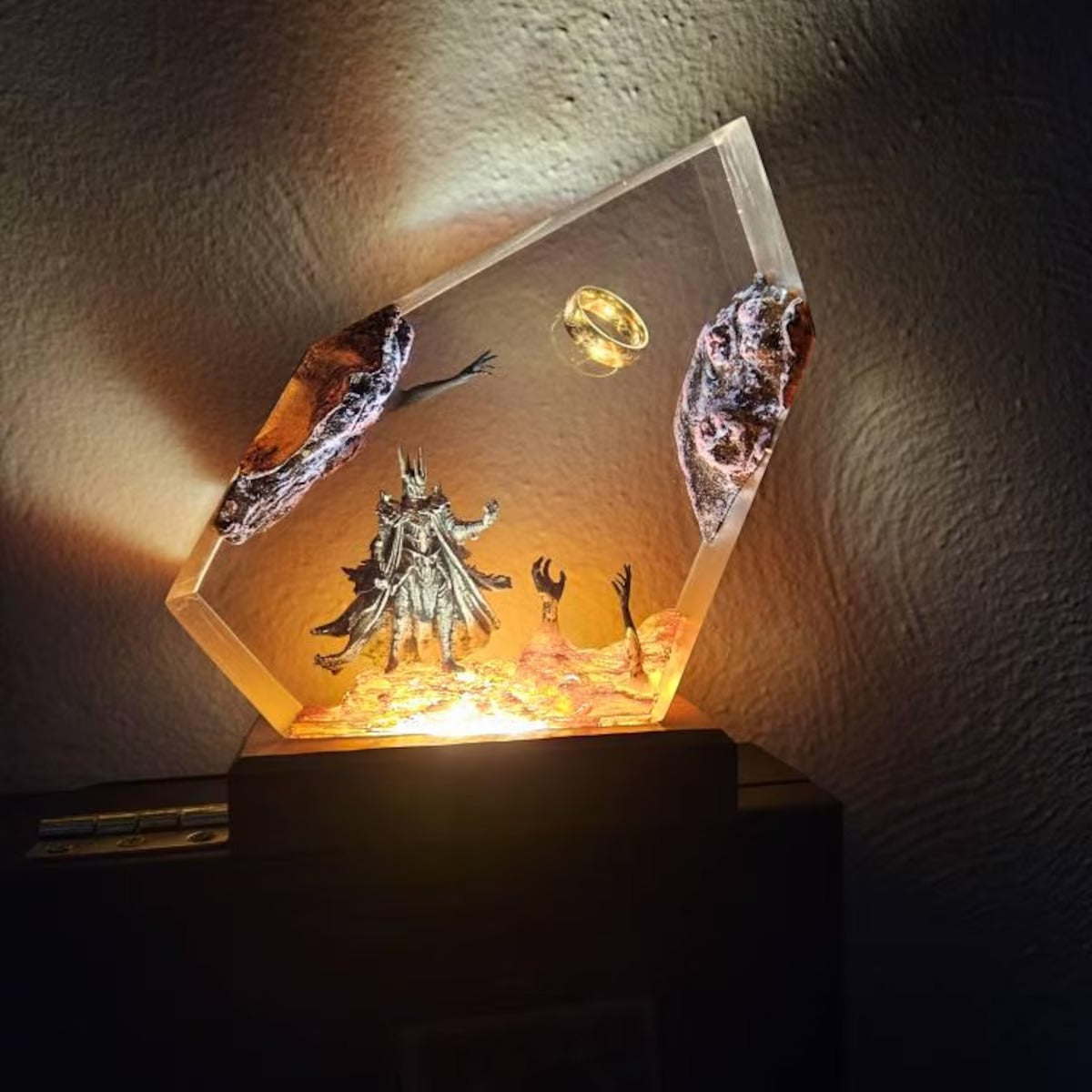 "Each lamp is crafted from crystal-clear polished resin with hand-painted miniature scenes and a hand-built wooden LED base. Designed to capture Middle-earth in light — every detail, every figure, every glow exists because we noticed things most people don't."