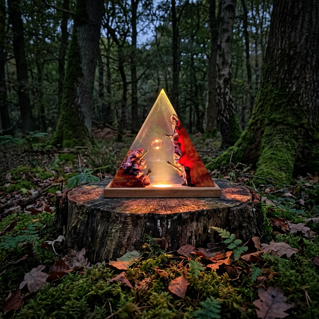 Hand-poured from crystal-clear resin with hand-painted detail and a solid wooden LED base.