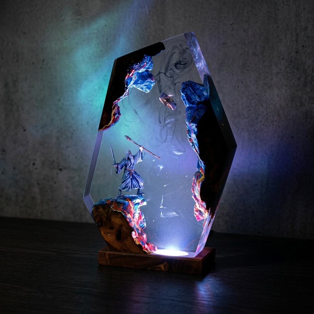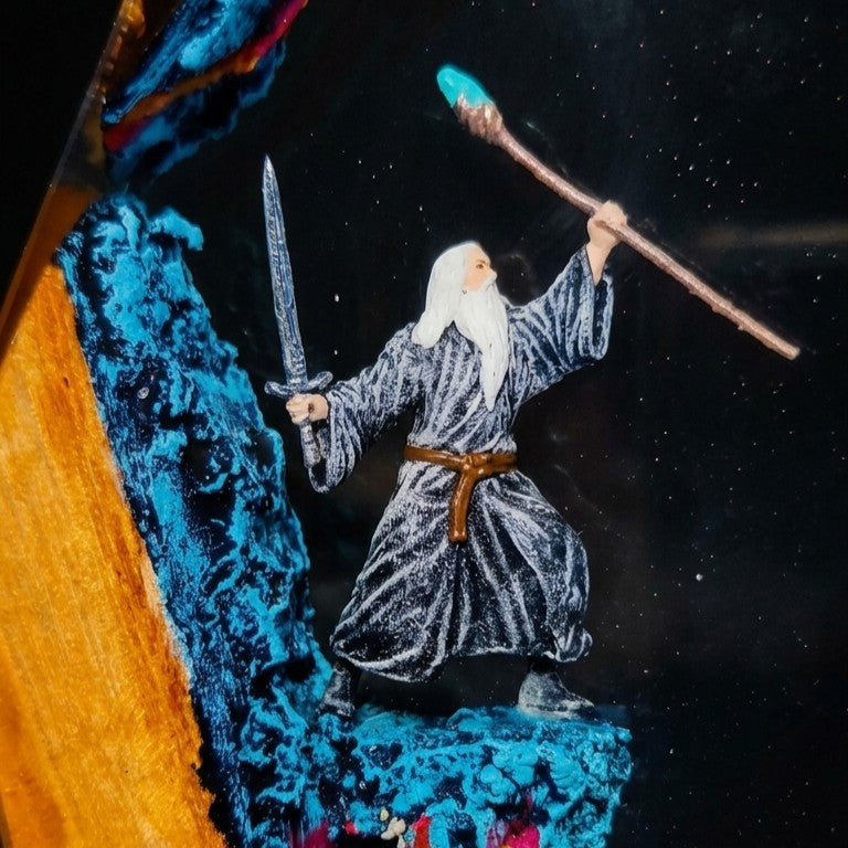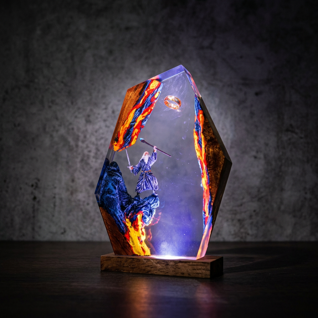 "Each lamp is crafted from crystal-clear polished resin with hand-painted miniature scenes and a hand-built wooden LED base. Designed to capture Middle-earth in light — every detail, every figure, every glow exists because we noticed things most people don't."