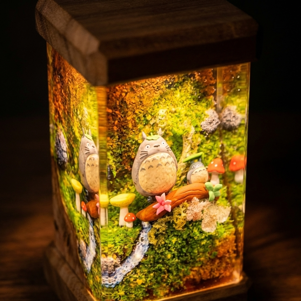 Each piece is a miniature diorama — hand-painted figures, detailed landscapes, and iconic moments from the films you grew up with, sealed inside crystal-clear resin with a built-in LED base. Turn the light on and the whole scene glows from within. Small batch. No shortcuts. Crafted for the dreamers.