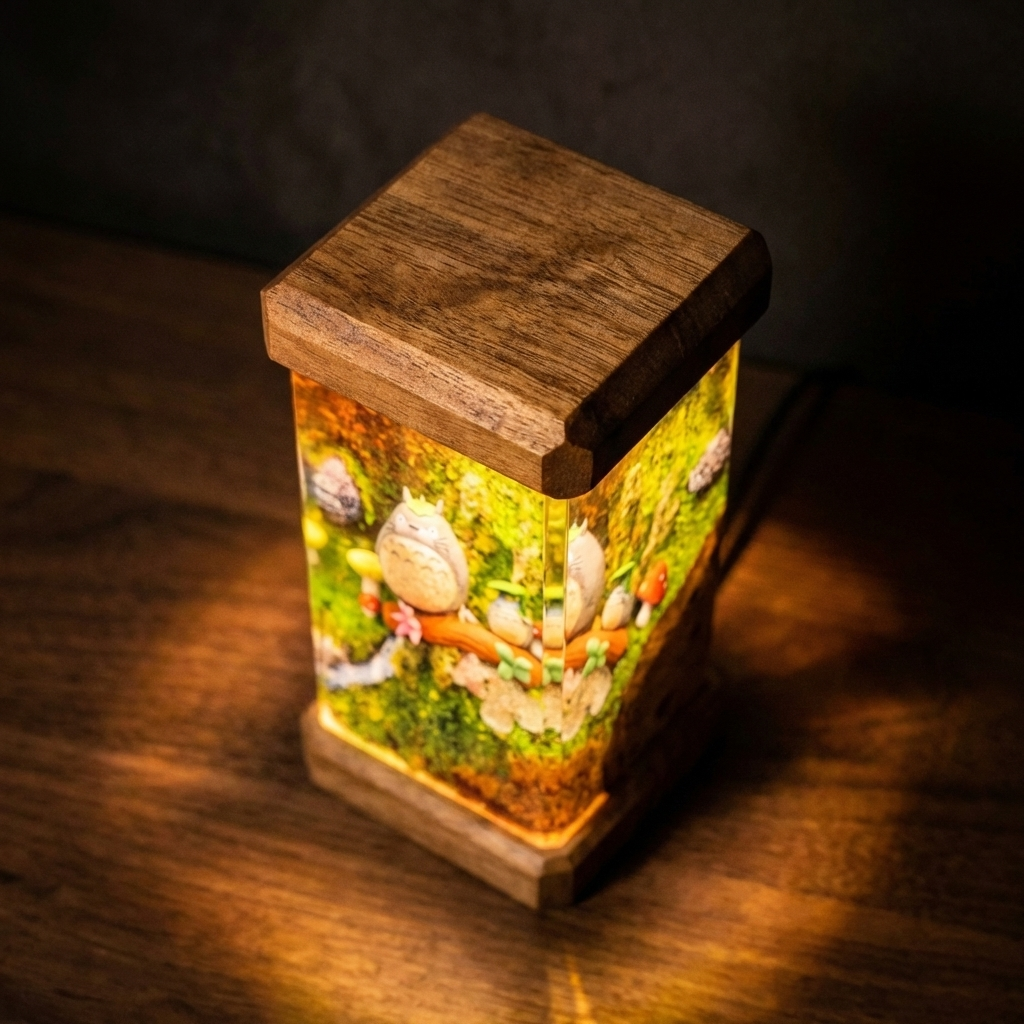 "Each lamp is crafted from crystal-clear polished resin with hand-painted miniature scenes and a hand-built wooden LED base. Designed to capture worlds of wonder in light — every detail, every figure, every glow exists because we noticed things most people don't."